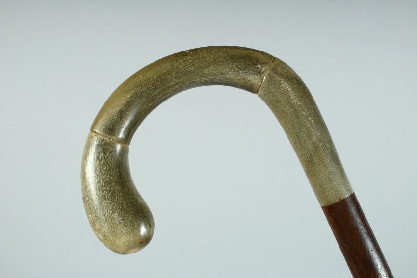 A VICTORIAN WALKING STICK with Rhino handle with plated band.
