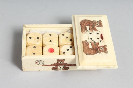 A BONE DICE BOX etched with teddy bears.