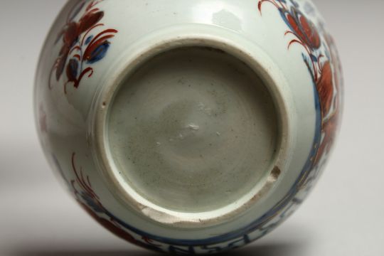 A CHAFFERS LIVERPOOL TEA BOWL painted in blue under glaze and glaze red with Swastika Fence pattern.