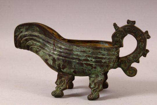 A CHINESE ARCHAIC STYLE TWIN HANDLE LIBATION CUP - with archaic style decoration