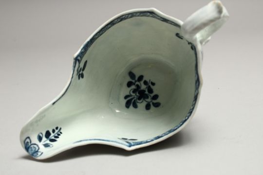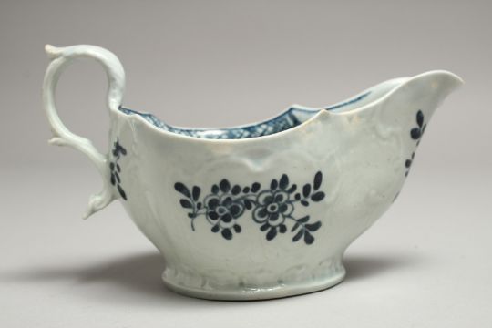 A JAMES PENNINGTON LIVERPOOL SAUCE BOAT well moulded and painted with blue under glaze flowers.