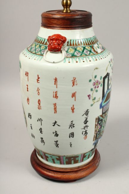 A GOOD CHINESE PORCELAIN LAMP with figures and calligraphy.