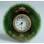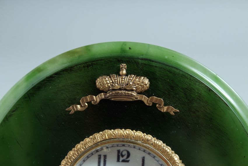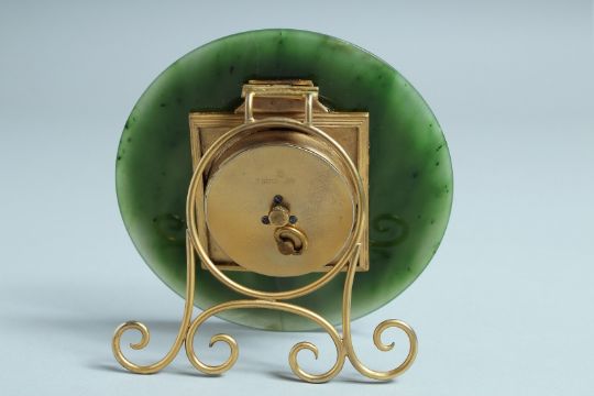 A SUPERB RUSSIAN SILVER GILT AND JADE CIRCULAR CLOCK on an easel support.