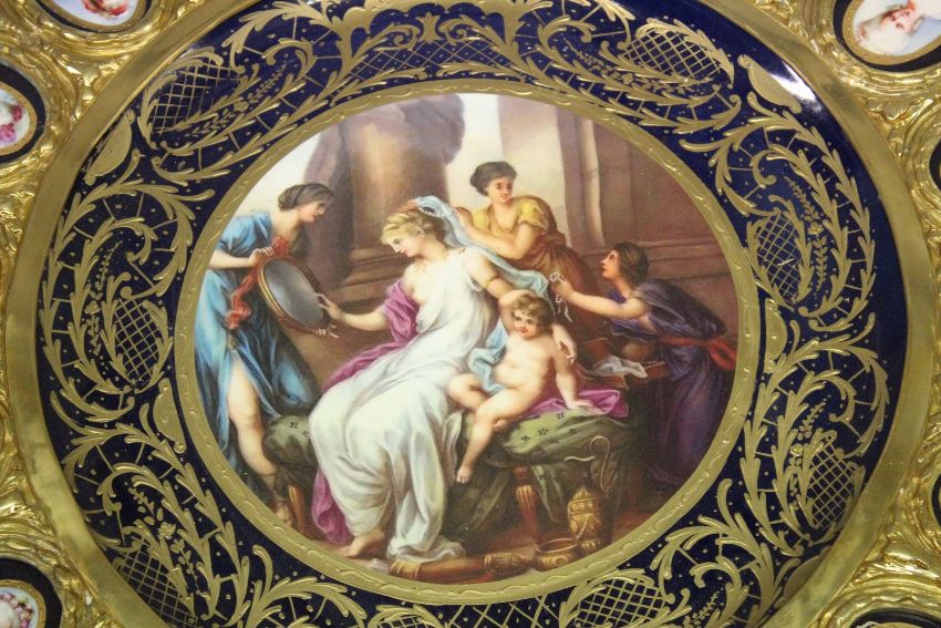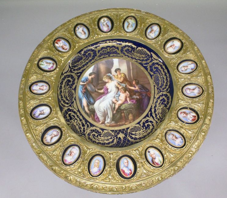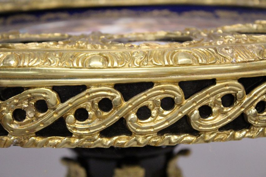 A VERY GOOD FRENCH SEVRES MANNER GILT CENTRE TABLE the top with a large portrait porcelain panel and eighteen portraits of ladies.