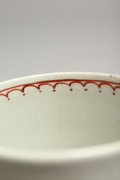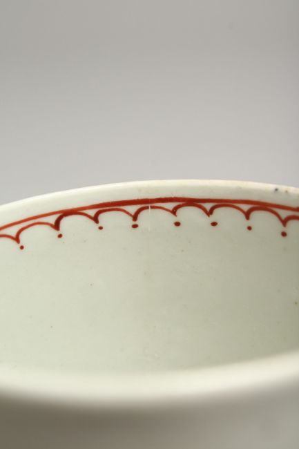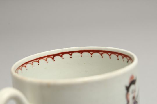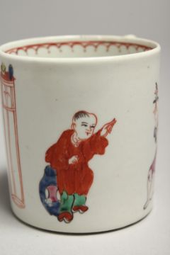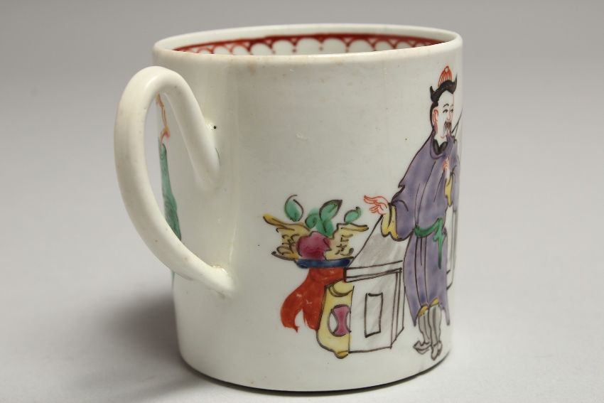 A CHRISTIAN LIVERPOOL FLAT BOTTOM COFFEE CAN painted in colour with three Oriental figures, a table and a tall stand.