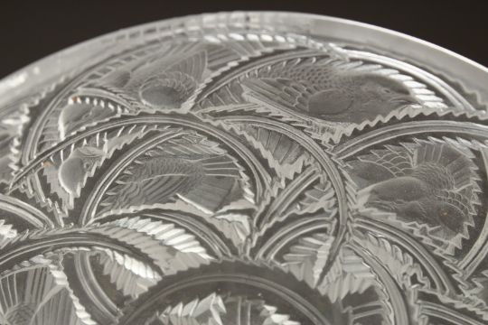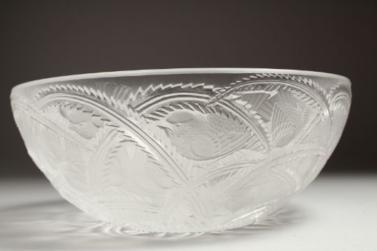 A LALIQUE GLASS CIRCULAR BOWL with chubby birds.
