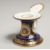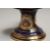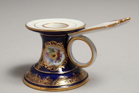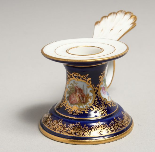 A SMALL 19TH CENTURY MEISSEN CANDLESTICK, blue ground edged in gilt with painted panels.