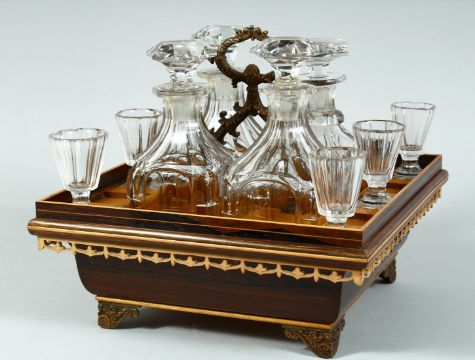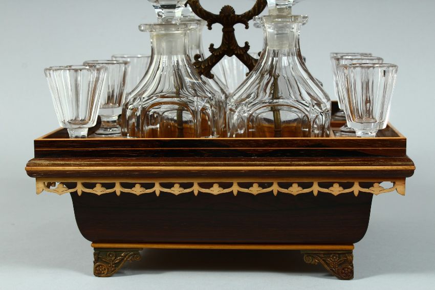 A SUPERB 19TH CENTURY ROSEWOOD CASED LIQUEUR CASE, with inscribed lid opening to reveal four decanters and stoppers and eight glasses, brass carrying handles, to the sides, complete with key.