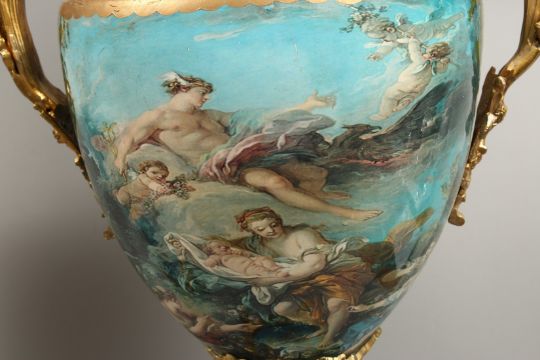 A LARGE PAIR OF SEVRES STYLE PORCELAIN VASES AND STANDS with classical scenes with ormolu mounts