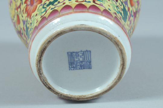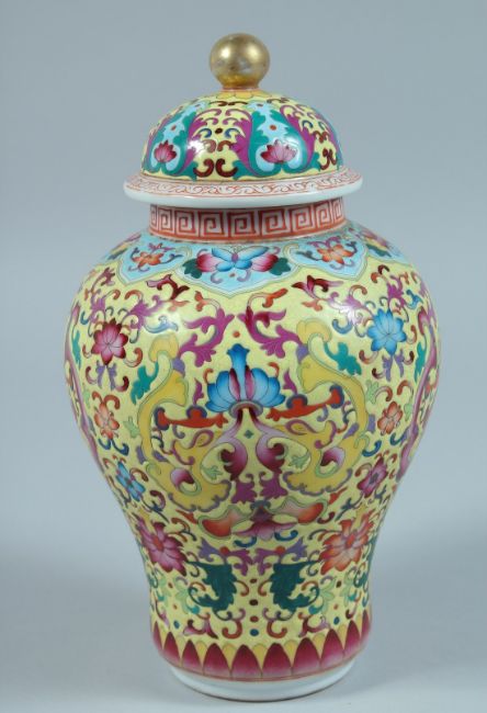 A CHINESE FAMILLE JAUNE CIRCULAR VASE AND COVER