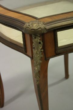 A VERY GOOD 19TH CENTURY FRENCH KINGWOOD SQUARE BIJOUTERIE TABLE with ormolu mounts, silk interior, glass panels to the sides and supported on curving legs.