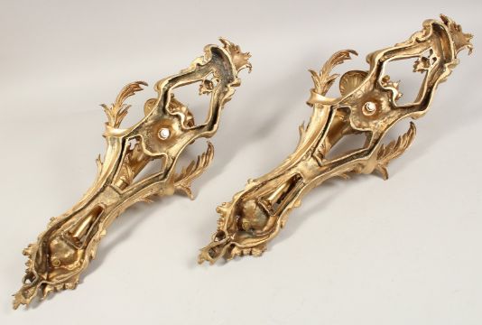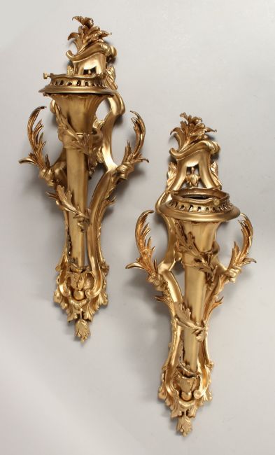 A GOOD PAIR OF GILT BRONZE SCONCES, AS TORCHES with acanthus scrolls.
