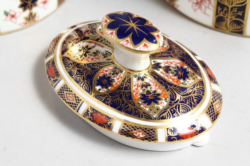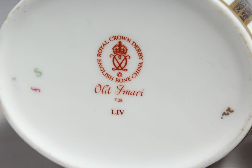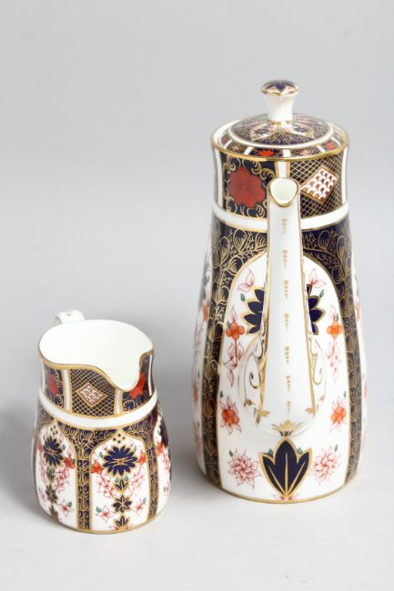A ROYAL CROWN DERBY OLD IMARI PATTERN COFFEE POT SUGAR BOWL AND MILK JUG, NO. 1128 (3).