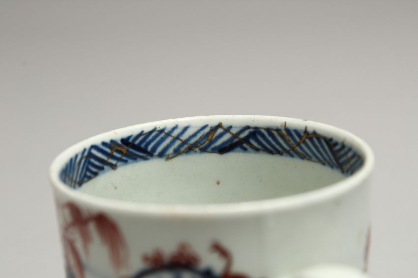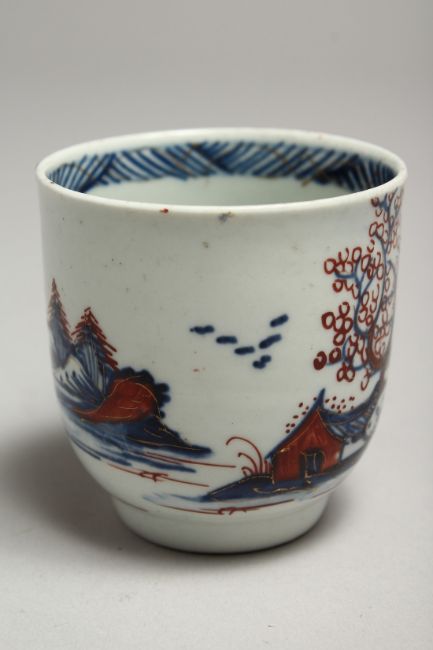 A CHAFFERS LIVERPOOL COFFEE CUP painted with a Chinoiserie scene of huts on an island, blue and red.