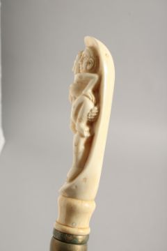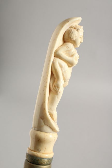 A BONE HANDLED WALKING STICK CARVE AS AN EROTIC SCENE.