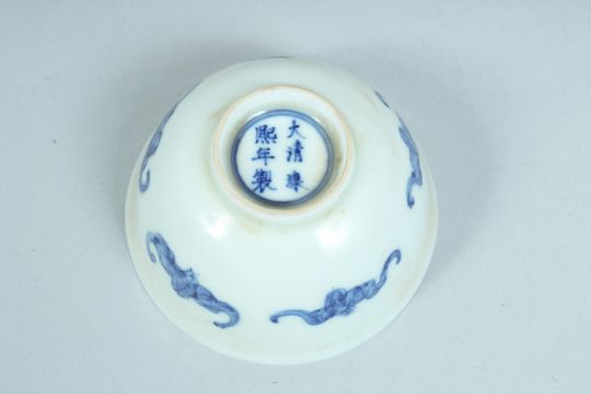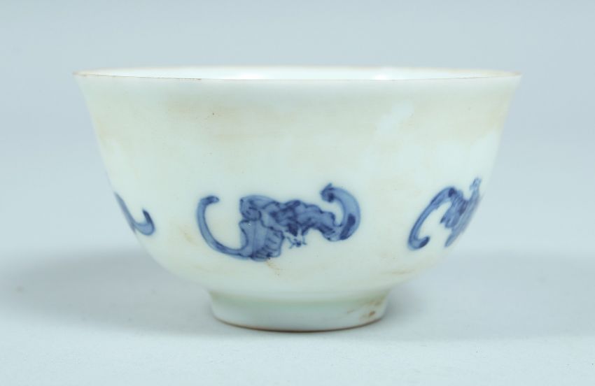 A CHINESE PORCELAIN TEA BOWL, the sides with bats.