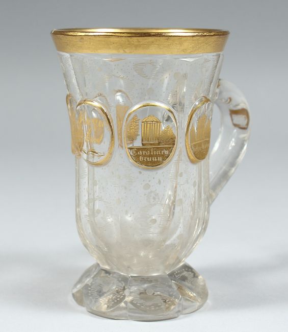 A GOOD CLEAR GLASS BOHEMIAN TANKARD with four gilt oval panels of buildings