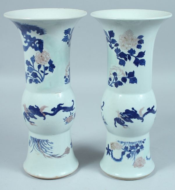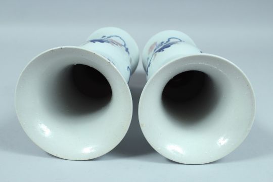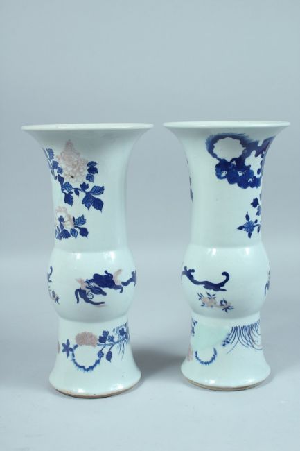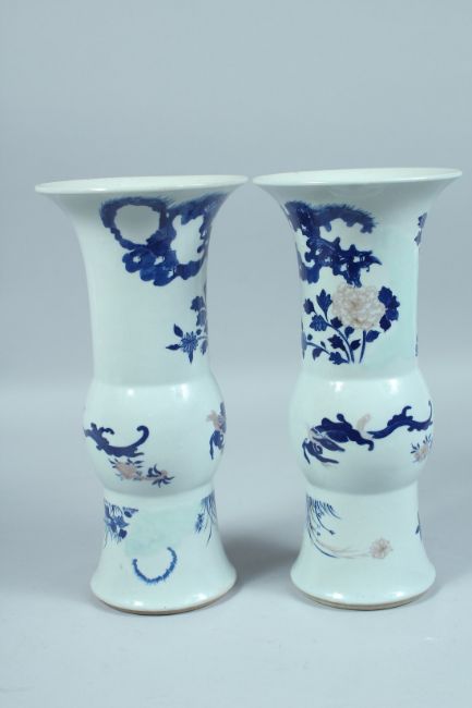 A PAIR OF CHINESE BLUE AND WHITE YEN-YEN VASES decorated with flowers and leaves.
