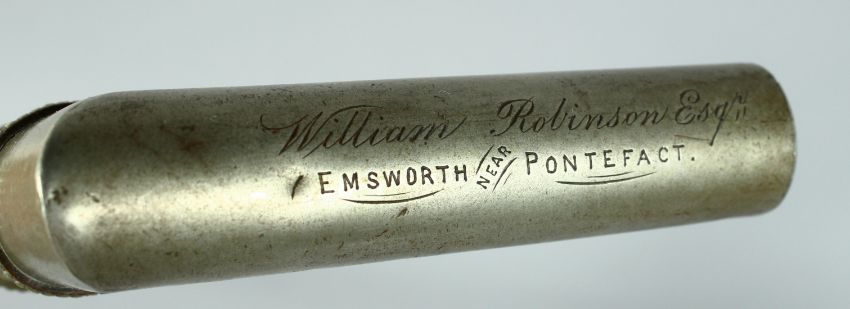 A VICTORIAN TWISTED BRIAR WALKING STICK with plate handle engraved 'William Robinson Esq. Emsworth, Near Portsmouth'.