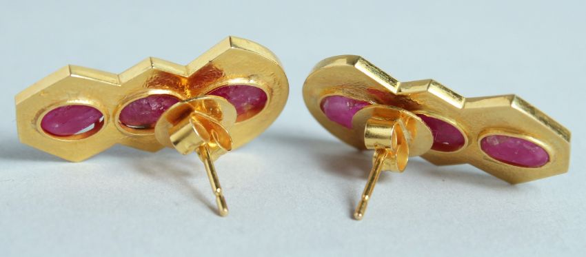 A GOOD PAIR OF CABOCHON RUBY EARRINGS in 18ct gold.