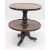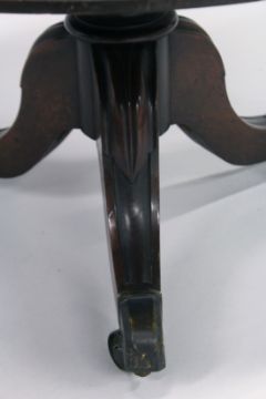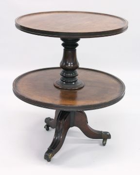 A GEORGIAN MAHOGANY CIRCULAR TWO TIER DUMB WAITER centre turned support, ending in tripod legs with brass casters.