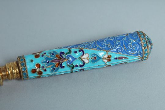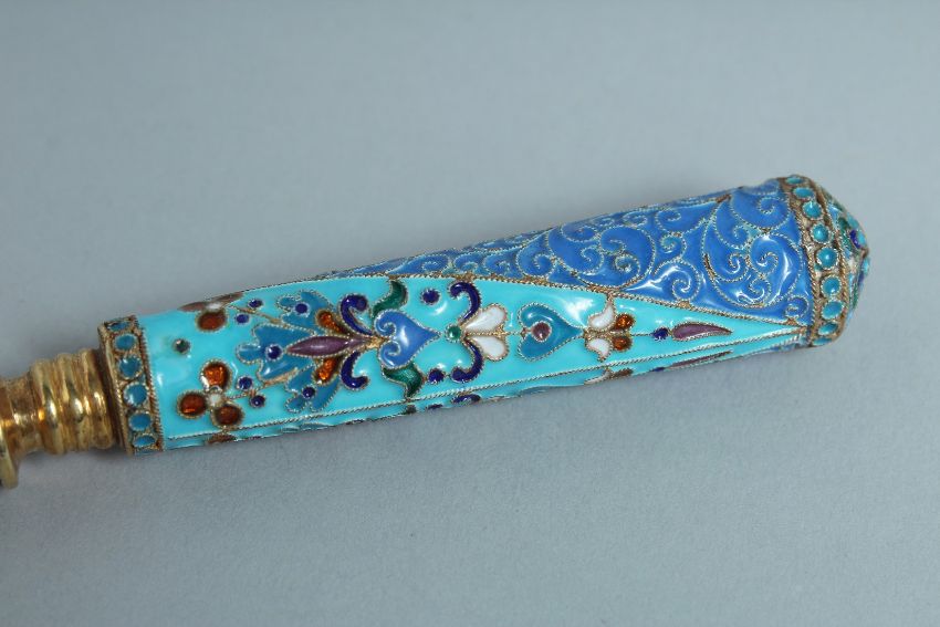 A GOOD RUSSIAN SILVER GILT AND ENAMEL SPOON.