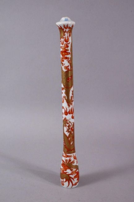 A CHINESE IRON RED & GILT DRAGON PORCELAIN PEN HOLDER OR PIPE, the body decorated with dragons and clouds, the top with a four character mark.