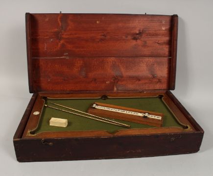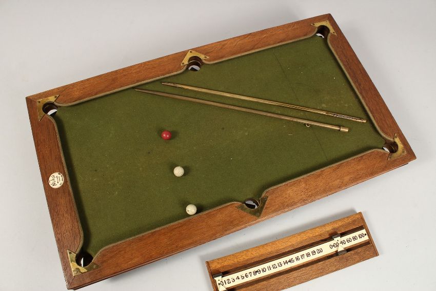 A RARE NUKU MINIATURE BILLIARD TABLE with slate base and green baize, in a fitted wooden case.