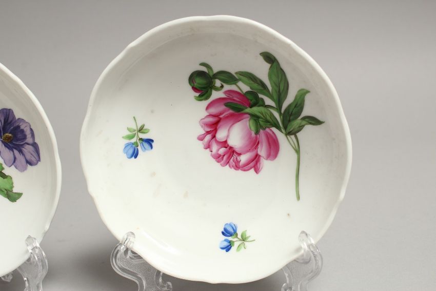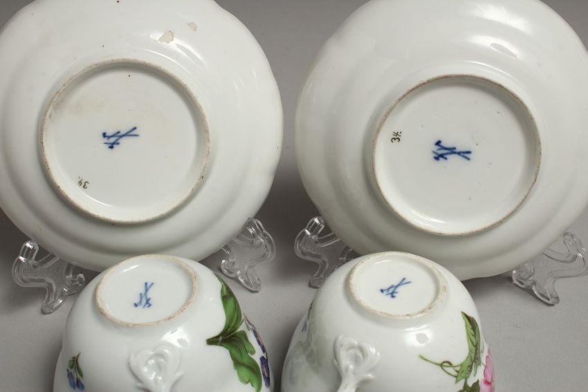 TWO MEISSEN CUPS AND SAUCERS painted with flowers.