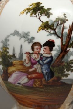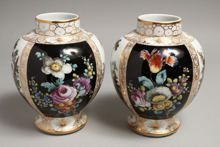 A PAIR OF DRESDEN AUGUSTUS REX VASES AND COVERS with panels of figures and flowers.