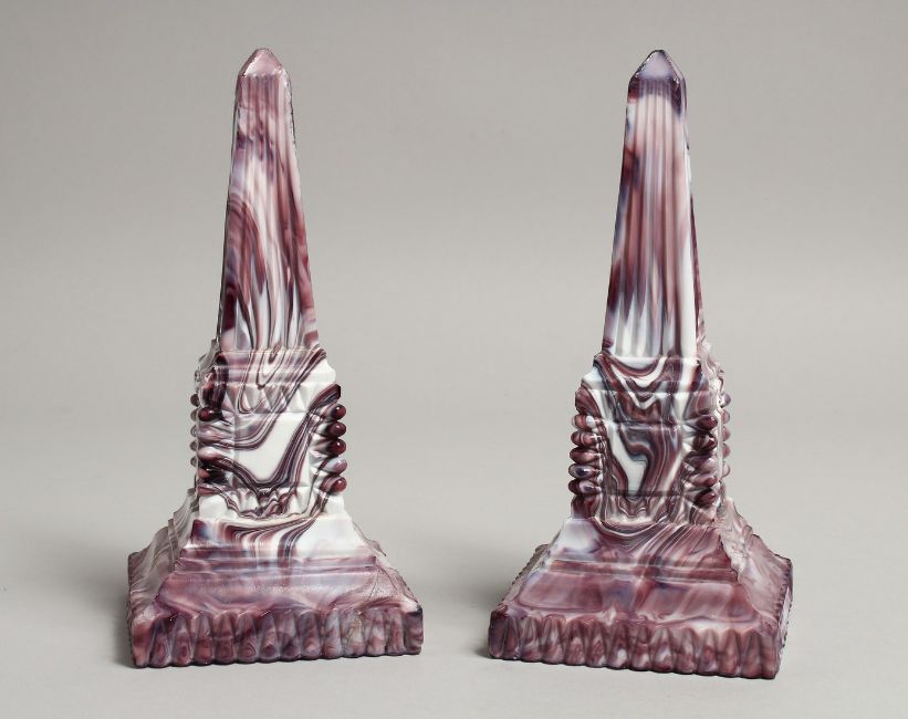 A PAIR OF SLAG GLASS OBELISKS.