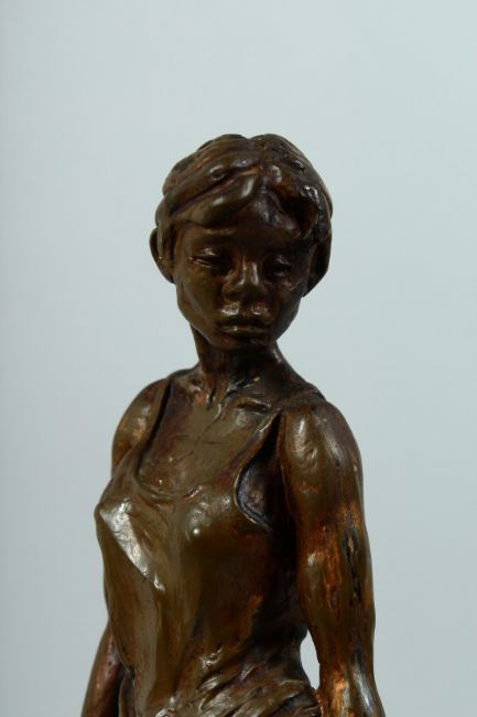 A BRONZE STANDING FEMALE FIGURE on a square base.