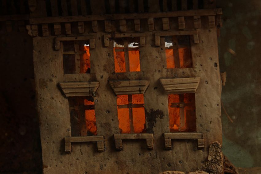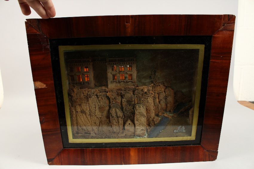 A FRAMED AND GLAZED CORK PICTURE, building on rocks, it lights up.