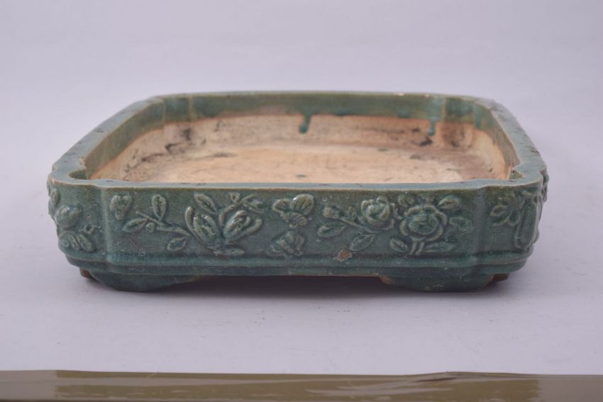 TWO LARGE CHINESE GREEN GLAZED RECTANGULAR PLANTERS, with raised floral decoration.
