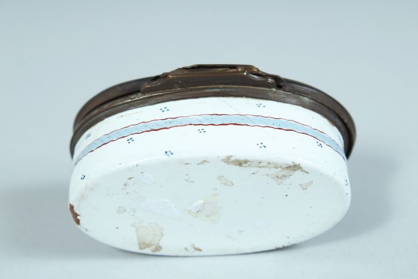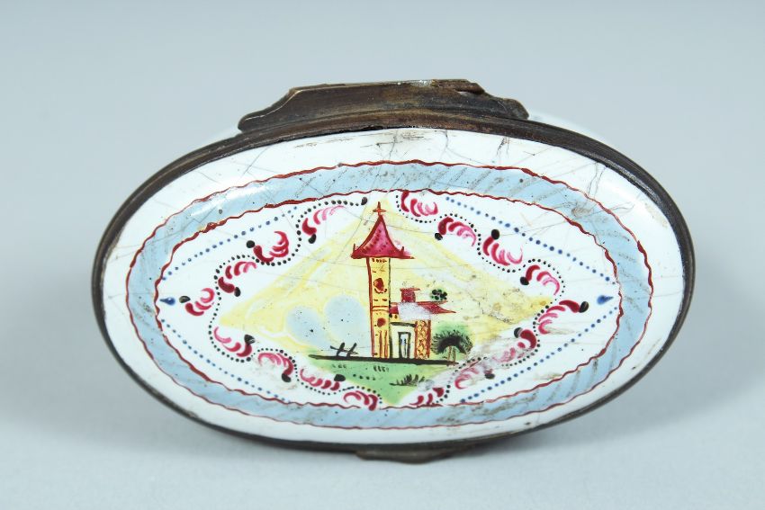 A BATTERSEA OR BILSTON ENAMEL OVAL PILL BOX.