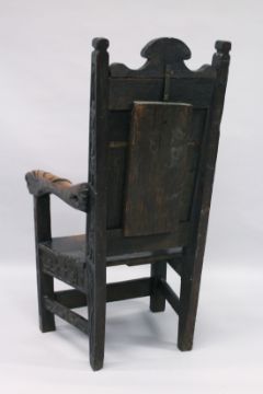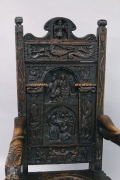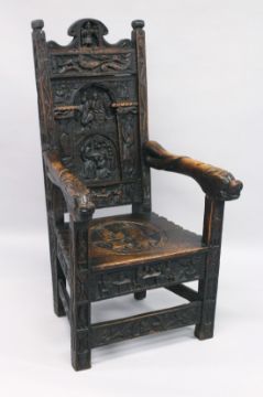 A GOOD 19TH CENTURY REPLICA OF A 14TH / 15TH CENTURY OAK ARMCHAIR carved with figures, emblems and motifs.