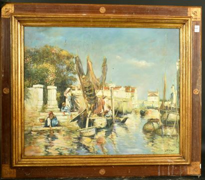 Eugene Leroy, figures collecting water, oil on canvas, signed, 19.75" x 28.75" (50 x 73cm).