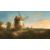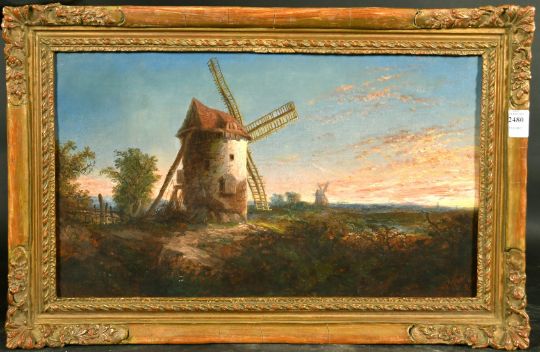 19th Century, Windmills in a landscape with a red and orange sky, oil on canvas, indistinctly signed and dated 1865, Cedar House, Ripley trade label verso, 12" x 20".