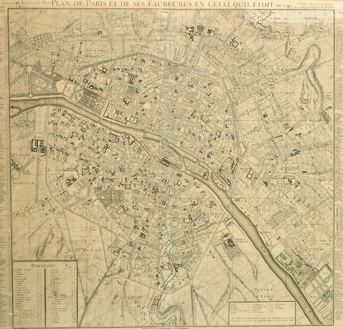 An 18th Century French map of Paris, 21" x 27" (53 x 68cm), along with a French map of England, 19" x 25" (48 x 64cm), and a French map of the British Isles, 11" x 17" (28 x 43cm), (3).