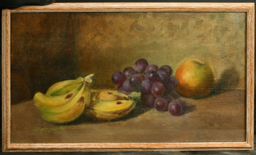 W. Weber, A still life of bananas, grapes and an apple, oil on canvas board, bears signature, 9" x 17.5", (23 x 44cm).