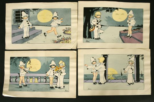 A set of four early 20th Century French pochoirs of children as Pierrot and Columbine, 6" x 9.5", unframed, along with a group of miscellaneous prints, (q).