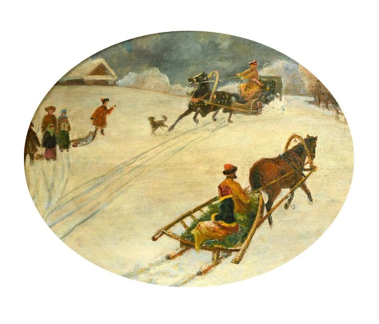19th Century, figures on horse drawn sledges, oil on canvas laid down, 11.75" x 16" (30 x 40cm), (oval).