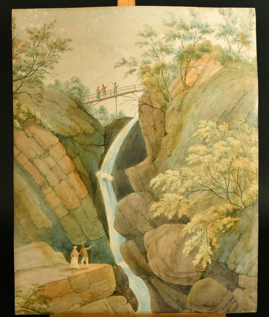 Circle of J.M.W. Turner, A coastal scene, inscribed 'Broadstairs', watercolour, 9.75" x 13.5", (25 x 34.5cm), and a view of figures admiring a waterfall in the manner of John White Abbot watercolour, 15" x 12", (38 x 30.5cm) (unframed) (2).