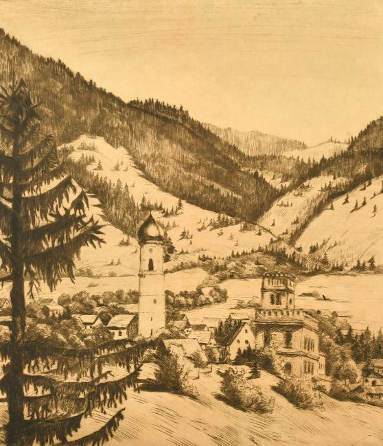 K. Flocks (19th/20th Century) European. "Radierung, Oberammergau", etching, indistinctly signed and inscribed in pencil, 10" x 8.75" together with four other etchings by various hands, (unframed) (5).