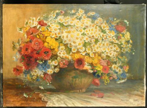 Ersebeth Kalicza (1879-1943) Hungarian, A still life of poppies, daisies and cornflowers in a bowl, oil on canvas, signed, 27.75" x 39.5", (unframed).