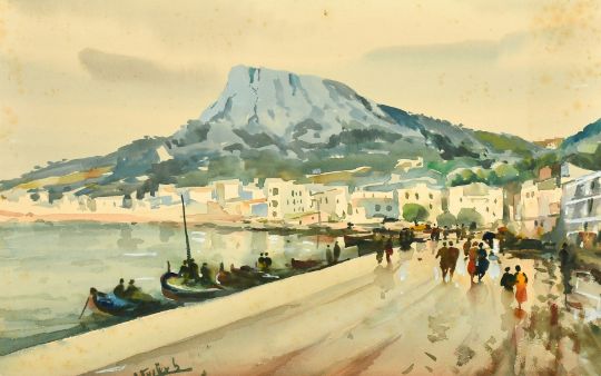 20th Century European School. A Mediterranean harbour scene with moored boats and figures, watercolour, indistinctly signed, 12" x 18.5", (unframed).