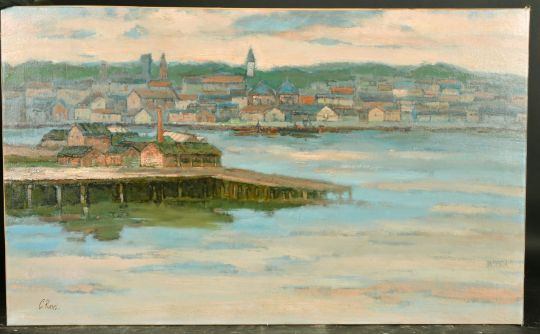 C. Ravel, 20th Century, an extensive view of house along the water's edge and buildings by a jetty, oil on canvas, signed, 22" x 36", (56 x 91.5 cm) (unframed).