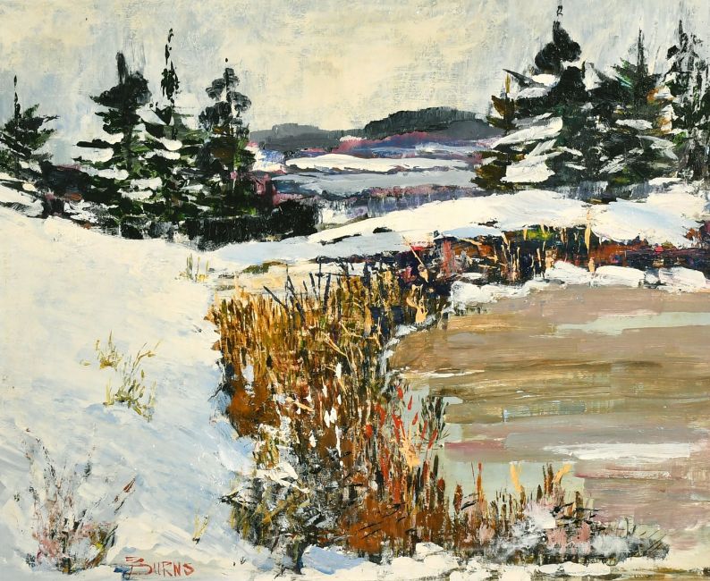 Canadian School circa 1980, 'Rice Lake Peterborough', A winter snow scene by a reeded pond, oil on board, signed Burns, inscription verso, 18" x 22".