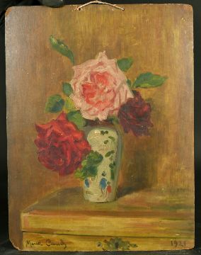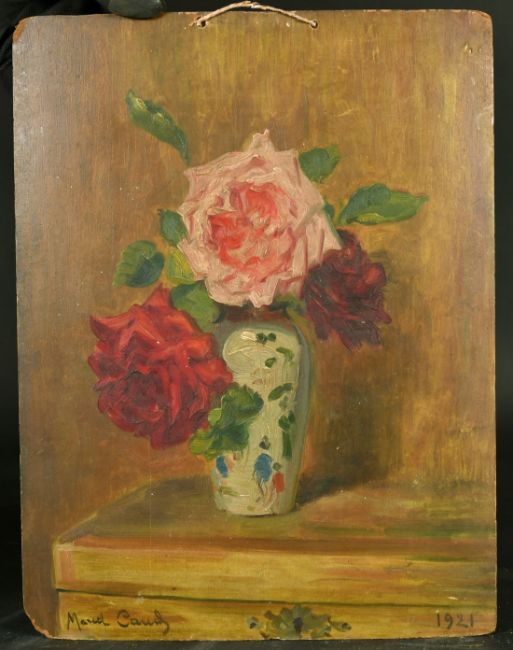 French School circa 1921, a still life of roses in an oriental vase, oil on board, indistinctly signed, 13.5" x 10.5" (34 x 27cm), (unframed).