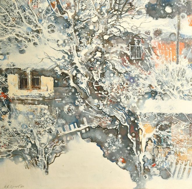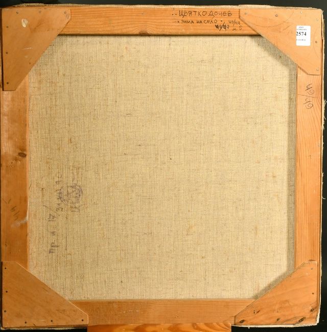 Eastern European School 20th Century, Buildings and trees under snow, oil on canvas, signed and dated '89, inscription on stretcher verso, 19.5" x 19.5", (49.5 x 49.5cm) (unframed).
